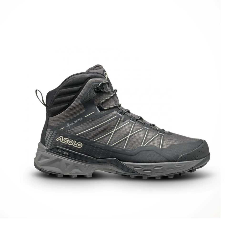 Mid-cut Tahoe Gtx in polyester upper reinforced with Tpu material offers protection and comfort while the Gore-Tex Extended Comfort Footwear lining guarantees waterproofness and breathability. The mono-density Eva midsole assures the stability, support, comfort and cushioning. The AS-Tech technology is designed and incorporated to give structure and torsion stability. The Asolo Cross outsole has a self cleaning design and assures the best traction and grip, thanks to the Sigma Grip compound, developed by Asolo. To complete the model a Tpu cap for an additional protection, the thermo-shaped tongue to guarantee the best fit and the webbing lacing system to assure a precise and fast lace up.