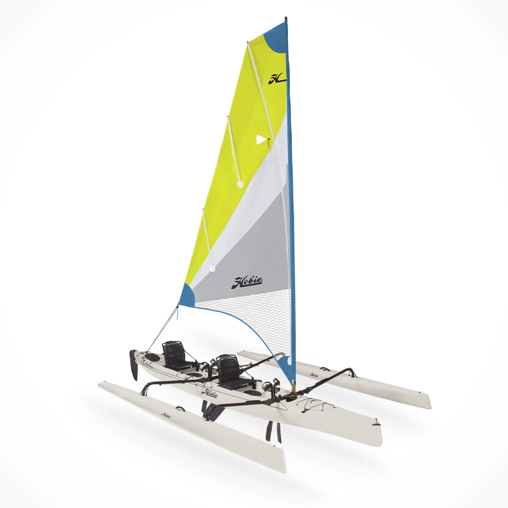 Hop aboard with a friend. With dual MirageDrive 180s providing forward and reverse pedal power, maneuvering is a snap even when the zephyrs subside. Hobie’s patented Kick-Up Fins automatically “kick-up” on contact with an underwater obstacle and automatically adjust back into place once clear. The central hull is pure high-end Hobie with all the expected features: multiple Twist and Seal hatches, a large bow hatch for below-decks storage, lever-operated rudder and centerboard deployment and dual rudder control. This is Hobie’s ultimate fish hunter, capable of marlin teasing trolling speeds.